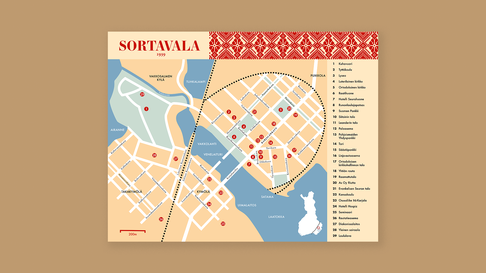 Näyttelyn visuaalinen ilme vie ajatukset menneeseen aikaan, mutta on samalla selkeä, yksinkertainen ja moderni. Visuaalisen ilmeen punaisena lankana toimii karjalaisen käspaikka-käsityöperinteen pohjalta suunniteltu kuvituselementti.